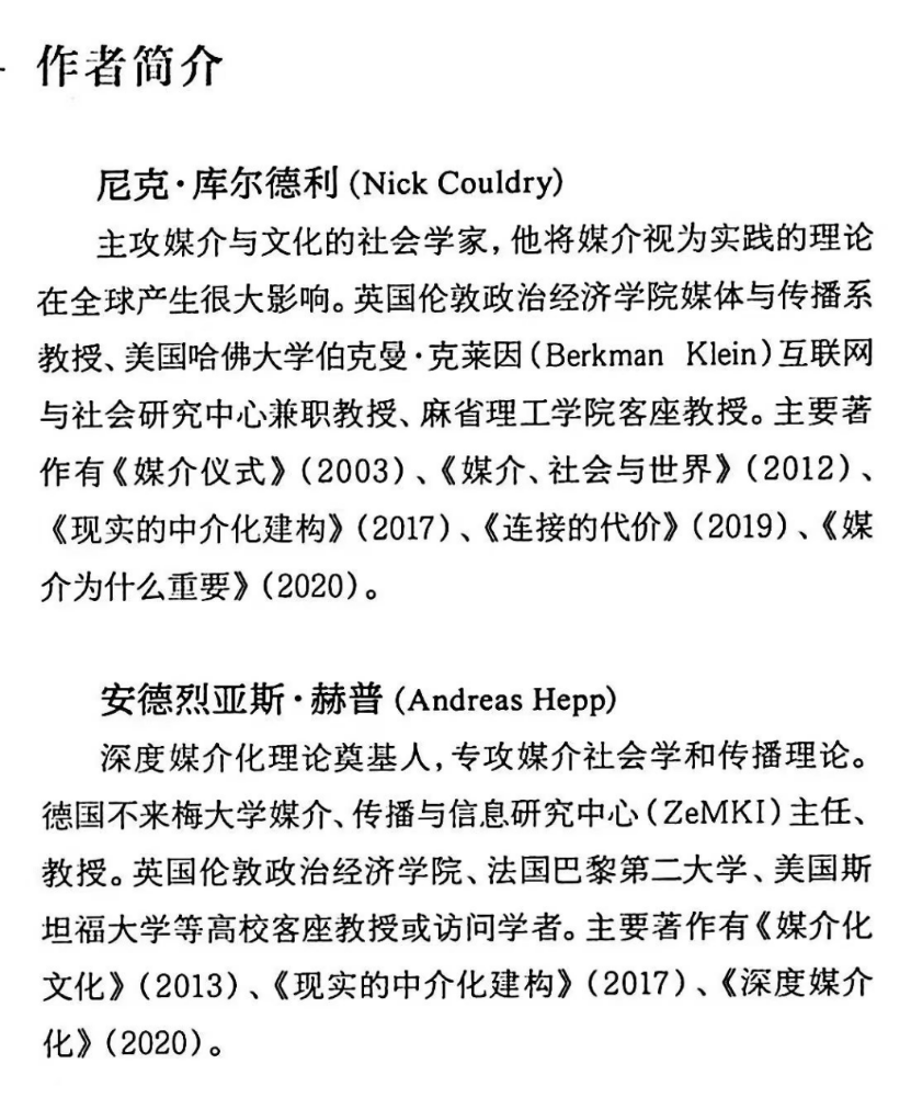 [英]尼克·库尔德利、[德]安德烈亚斯·赫普:《现实的中介化建构》,刘泱育译,上海:复旦大学出版社,2023年1月出版,2023年3月重印。