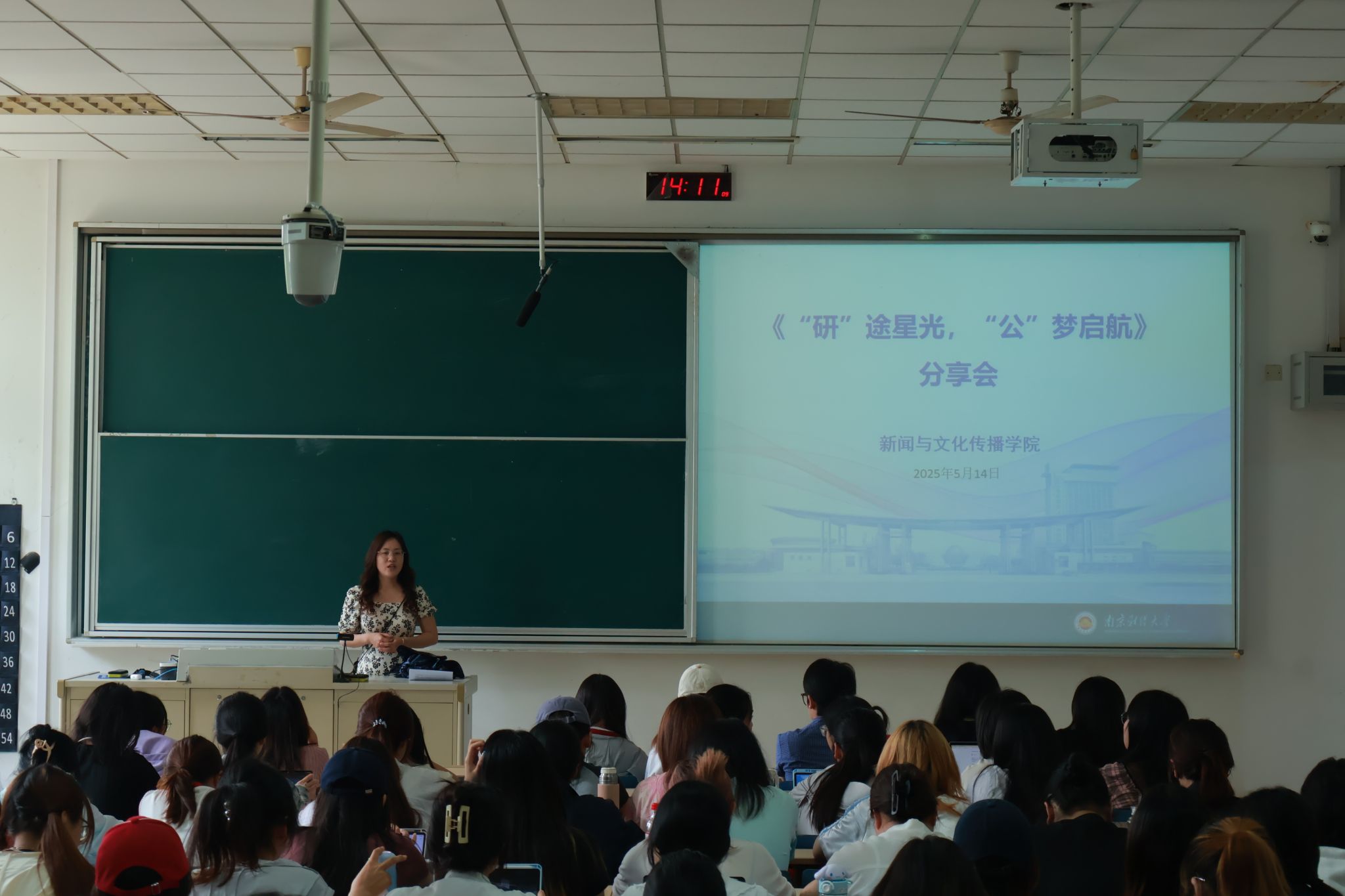 为帮助在校学生明确职业发展方向,增强学业规划意识,5月14日下午,新闻与文化传播学院在仙林校区德正楼101教室举办了主题为“‘研’途星光,‘公’梦起航”的毕业生经验分享会,由学院学工办主任杨柳主持,22级本科生参加了本次分享会。