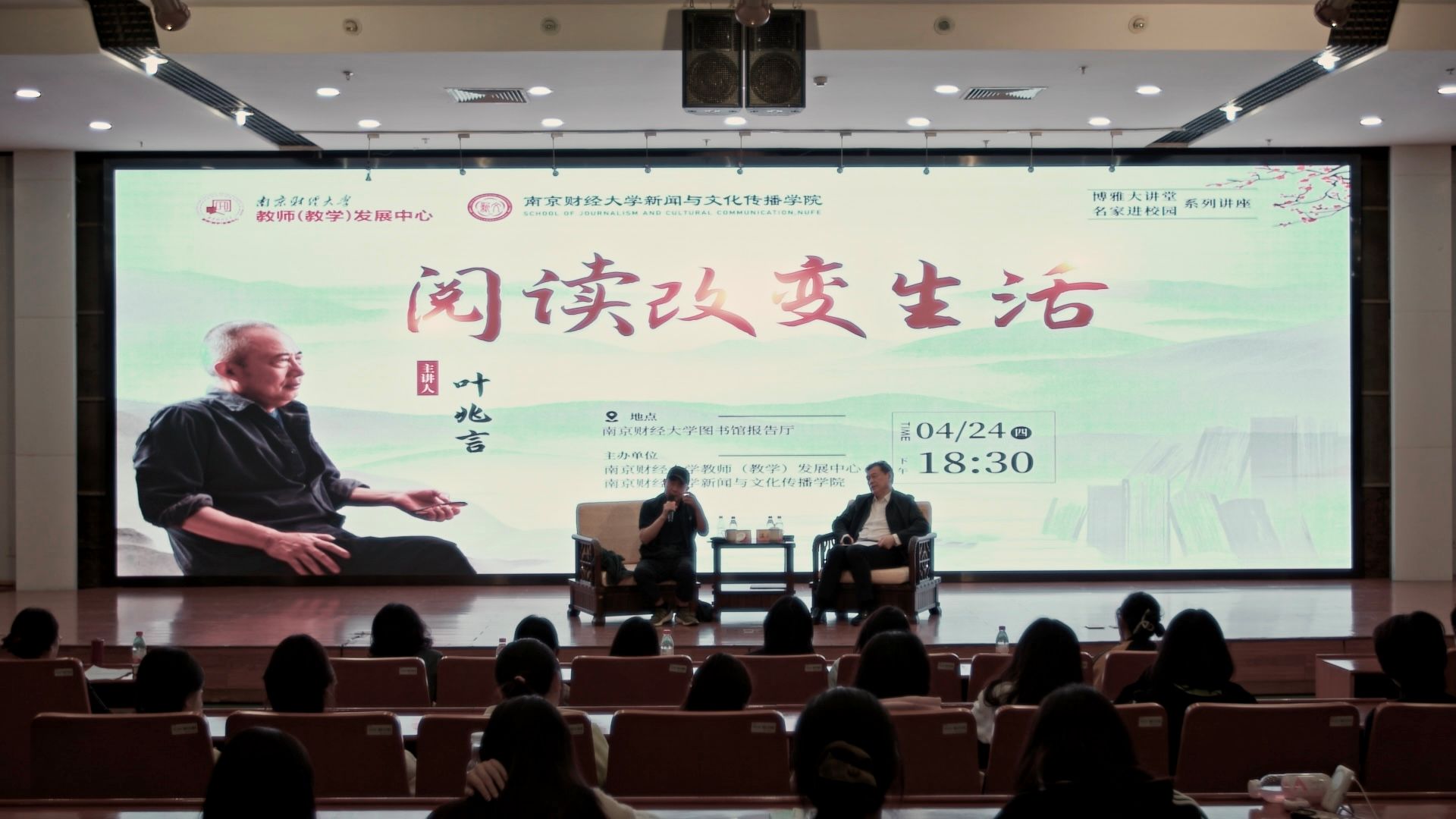 4月24日晚,由南京财经大学教师(教学)发展中心,南京财经大学新闻与文化传播学院联合主办的“名家进校园”系列活动第五场——“阅读改变生活”主题分享会在南京财经大学图书馆报告厅举行。中国作家协会第十届全国委员会委员、江苏省作家协会副主席、南京市作家协会主席,知名作家叶兆言受邀担任访谈嘉宾,南京财经大学新闻与文化传播学院教授、博士生导师温潘亚作访谈主持人,与近三百名师生共话文学与时代精神的联结,分享阅读的意义。