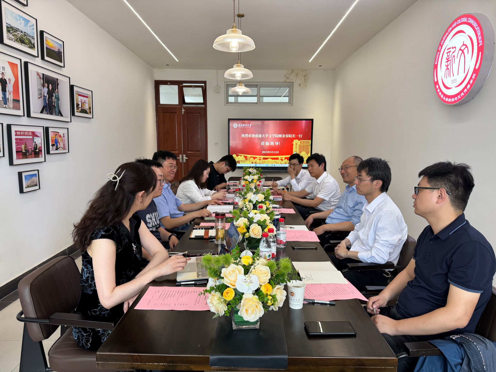 5月15日下午,南通大学文学院顾金春院长一行来我院调研交流,座谈会在仙林校区德正楼503会议室召开。院长刘泱育出席座谈会。南通大学文学院副院长施贤明、新闻系主任吉凯熙、古代文学教研室主任张佳、融媒体中心主任、实训中心主任晁晓峰,我院副院长刘霞云、新闻系系主任曹志伟、网络与新媒体系系主任夏羿、中文系系主任王华、融媒体中心主任吴晨翔参加。座谈会由刘泱育院长主持。