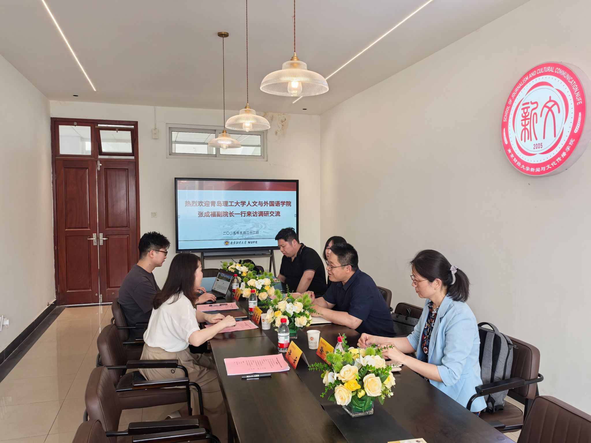 5月22日下午,青岛理工大学人文与外国语学院张成福副院长一行来我院调研交流,座谈会在德正楼503会议室召开。青岛理工大学人文与外国语学院副院长张成福、网络与新媒体系主任常宁、翻译硕士教育中心主任徐飞、网络与新媒体系副主任高正瀚,我院副院长刘霞云、网络与新媒体系主任夏羿、教学秘书许云参加。座谈会由刘霞云副院长主持。